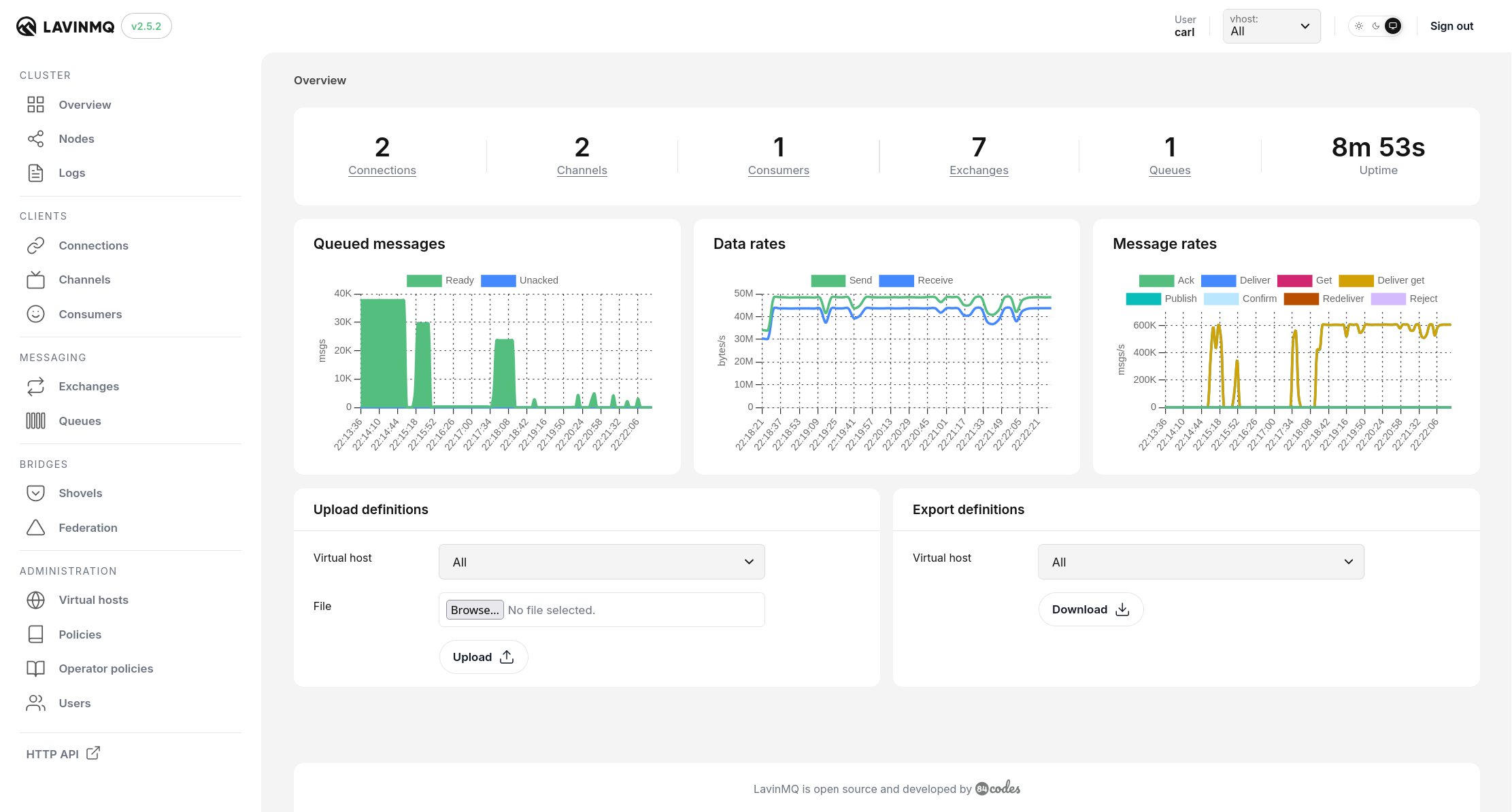 Publish rate: 612685 msgs/s Consume rate: 610925 msgs/s